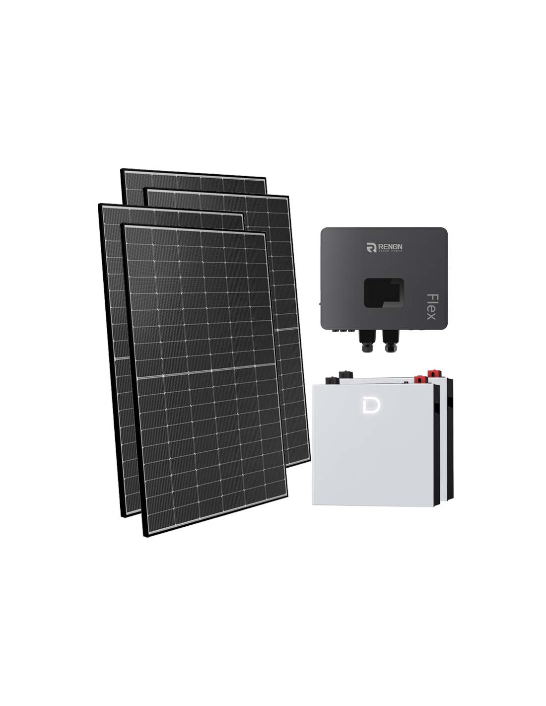 Photovoltaik-Set zum Anschluss an das Netz mit Dyness-Lithium-Batteriespeicher, Photovoltaik-Modulen und Renon Power-Wechselrichter. Das System entspricht der CEI-021-Verordnung für Photovoltaikspeicher.