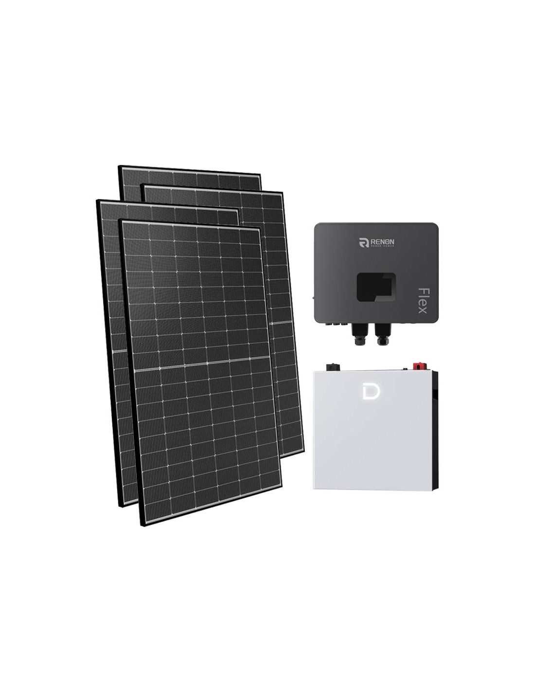 Photovoltaik-Set zum Anschluss an das Netz mit Dyness-Lithium-Batteriespeicher, Photovoltaik-Modulen und Renon Power-Wechselrichter. Das System entspricht der CEI-021-Verordnung für Photovoltaikspeicher.
