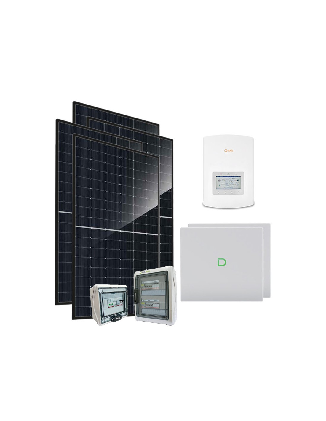 Photovoltaik-Kit für den Netzanschluss mit Dyness-Lithium-Batteriespeicher, Trinasolar-Photovoltaikmodulen und Solis-Wechselrichter.