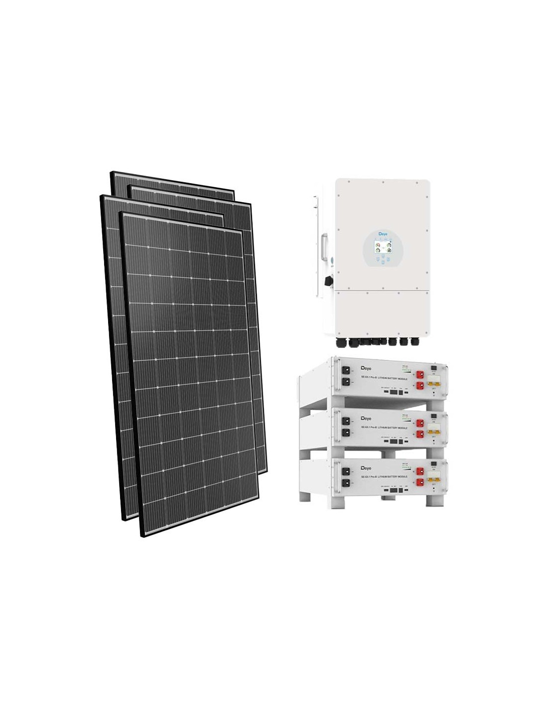 Photovoltaik-Kit für den Netzanschluss mit Deye-Lithiumbatteriespeicher, Photovoltaikmodulen und Deye-Wechselrichtern.
