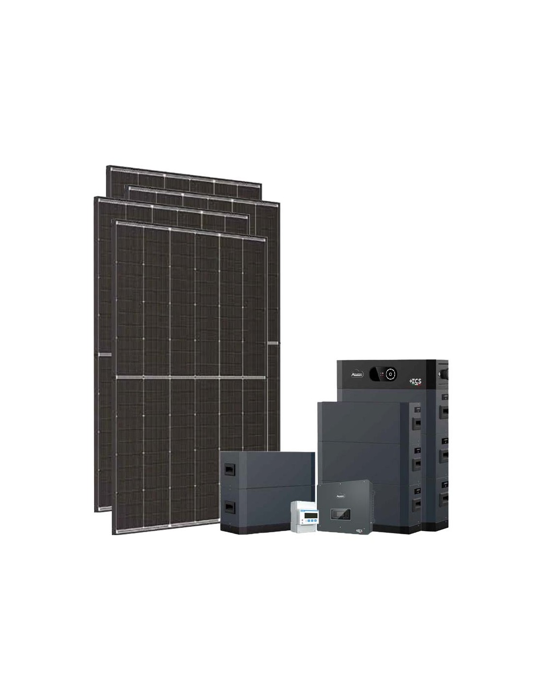Photovoltaik-Kit für den Netzanschluss mit ZCS Azzurro-Lithiumbatteriespeicher, Photovoltaikmodulen und ZCS Azzurro-Wechselrichtern.
