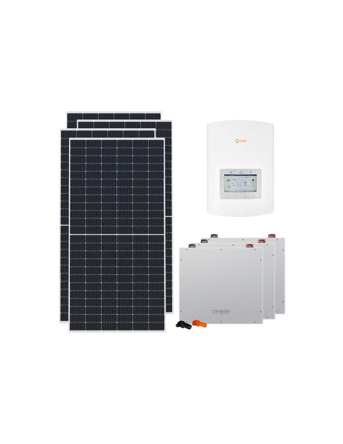 Photovoltaik-Kit für den Netzanschluss mit Dyness-Lithium-Batteriespeicher, Photovoltaik modulen und Solis-Wechselrichter.