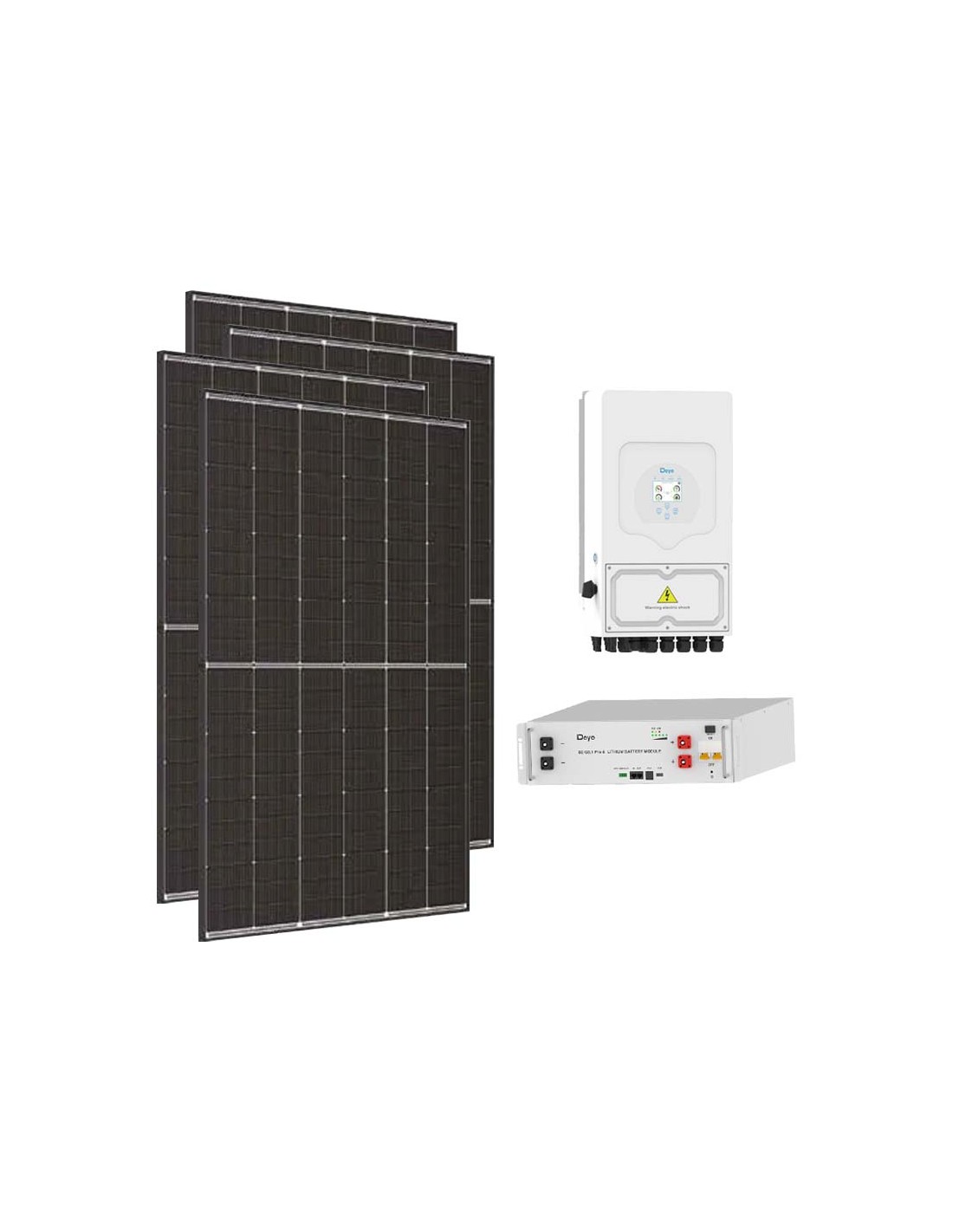 Photovoltaik-Kit für den Netzanschluss mit Deye-Lithiumbatteriespeicher, Photovoltaikmodulen und Deye-Wechselrichtern.