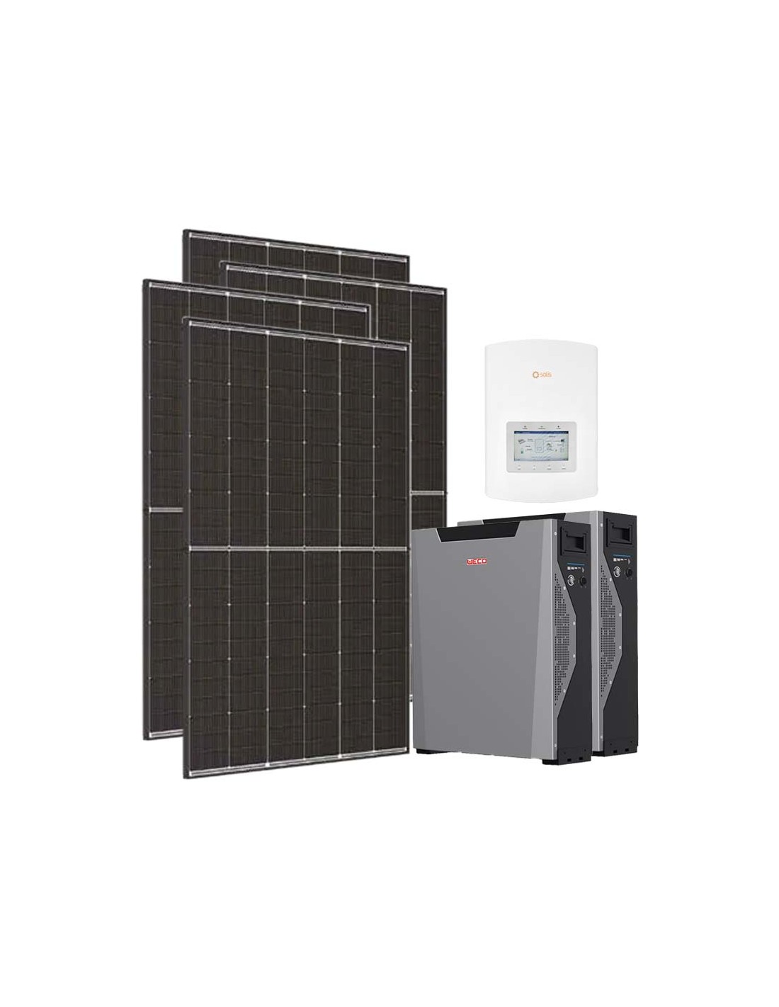 Photovoltaik-Set zum Anschluss an das Netz mit Weco-Lithium-Batteriespeicher, Photovoltaik-Modulen und Solis-Wechselrichter.