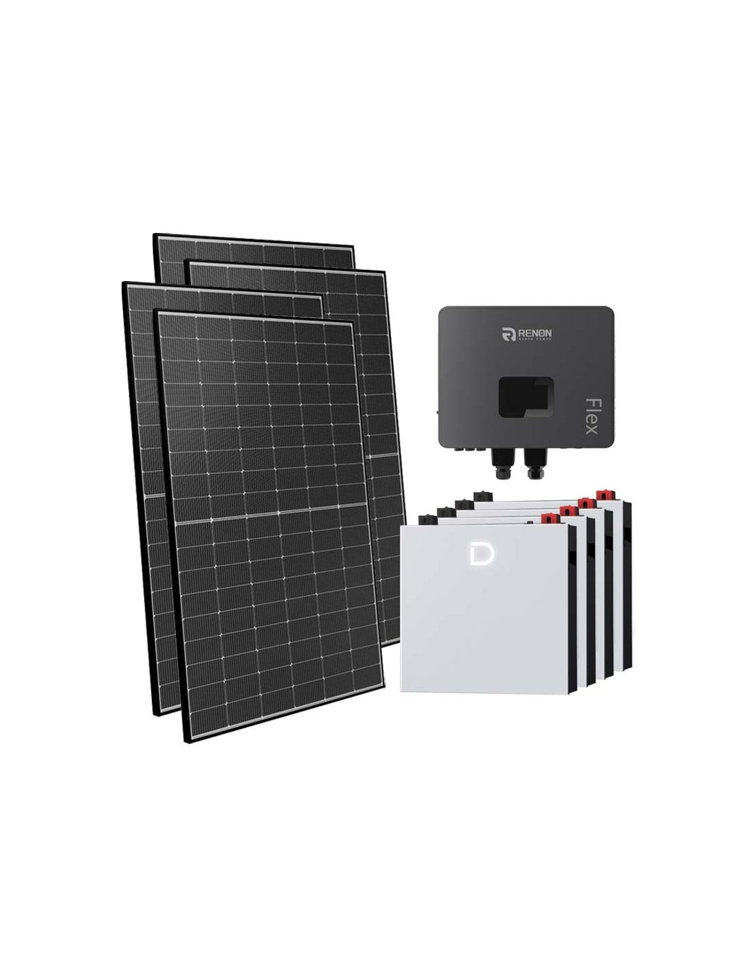 Kit fotovoltaico para conexión a red con almacenamiento en baterías de litio Dyness, módulos fotovoltaicos e inversor Renon Power. El sistema cumple con la normativa CEI-021 para almacenamiento fotovoltaico.