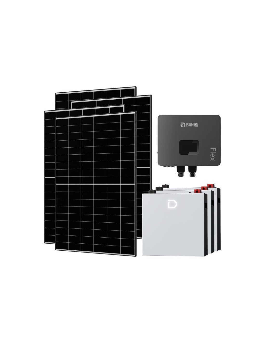 Kit fotovoltaico para conexión a red con almacenamiento en baterías de litio Dyness, módulos fotovoltaicos e inversor Renon Power. El sistema cumple con la normativa CEI-021 para almacenamiento fotovoltaico.