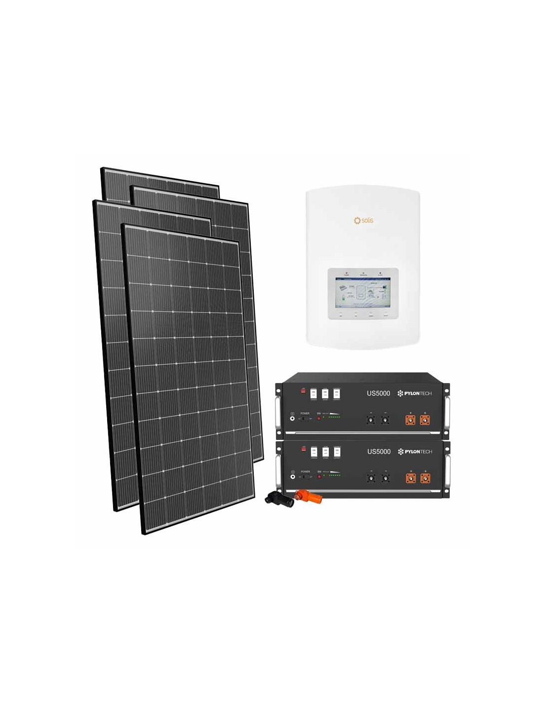 Kit fotovoltaico para conexión a red con acumulador de baterías de litio Pylontech, módulos fotovoltaicos e inversores Solis.