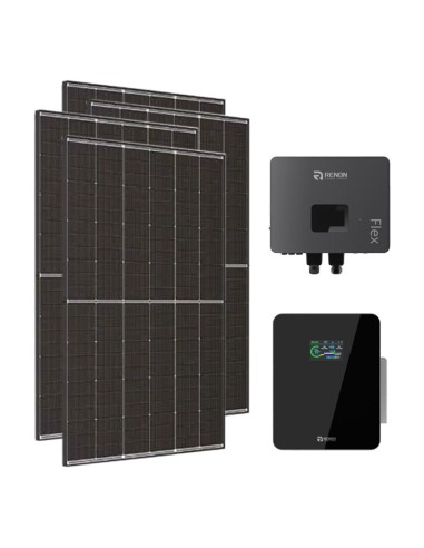 Kit fotovoltaico para conexión a red con almacenamiento en baterías de litio Xcellent, módulos fotovoltaicos e inversor Renon Power. El sistema cumple con la normativa CEI-021 para almacenamiento fotovoltaico.