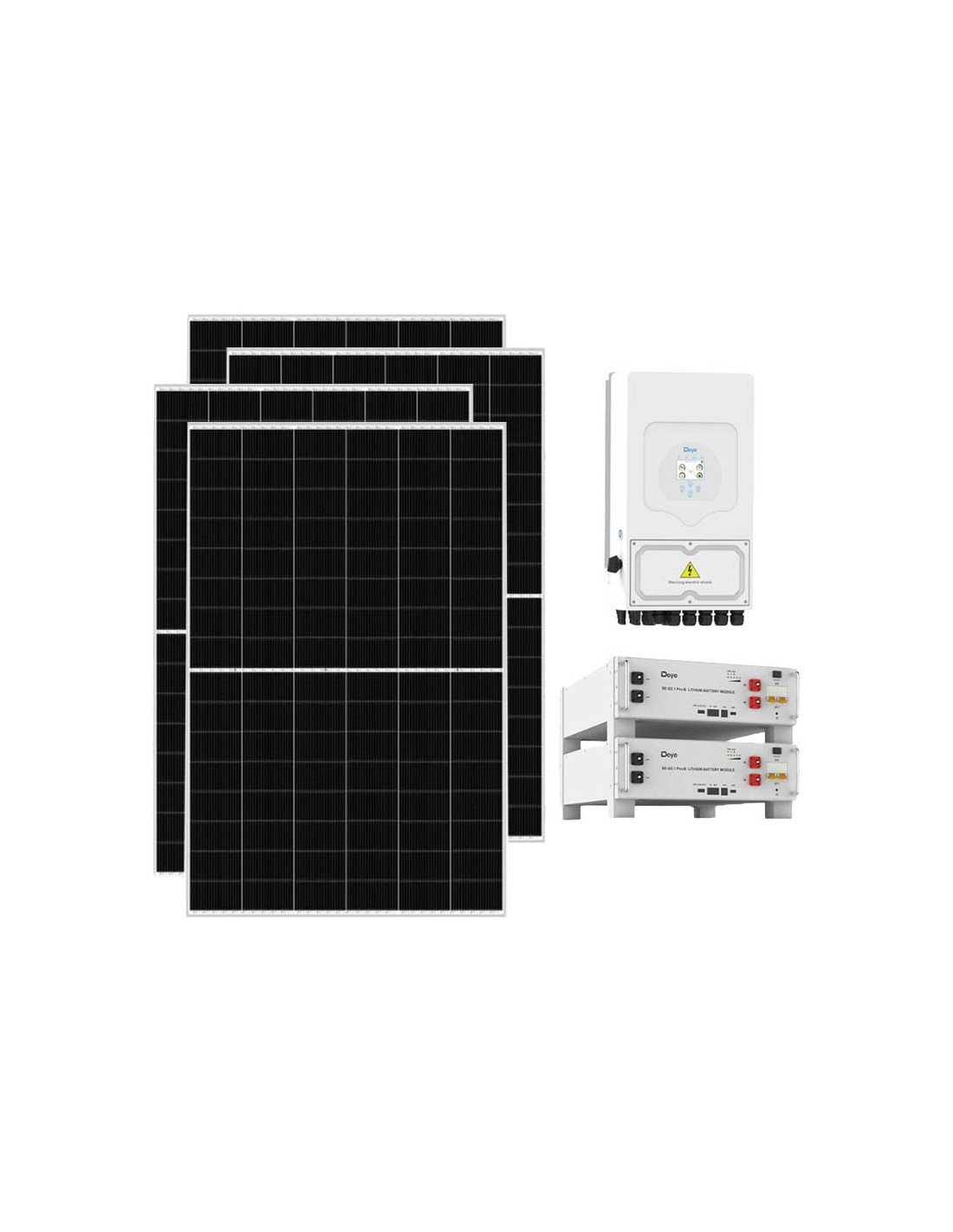 Kit fotovoltaico para conexión a red con acumulador de baterías de litio Deye, módulos fotovoltaicos e inversores Deye.