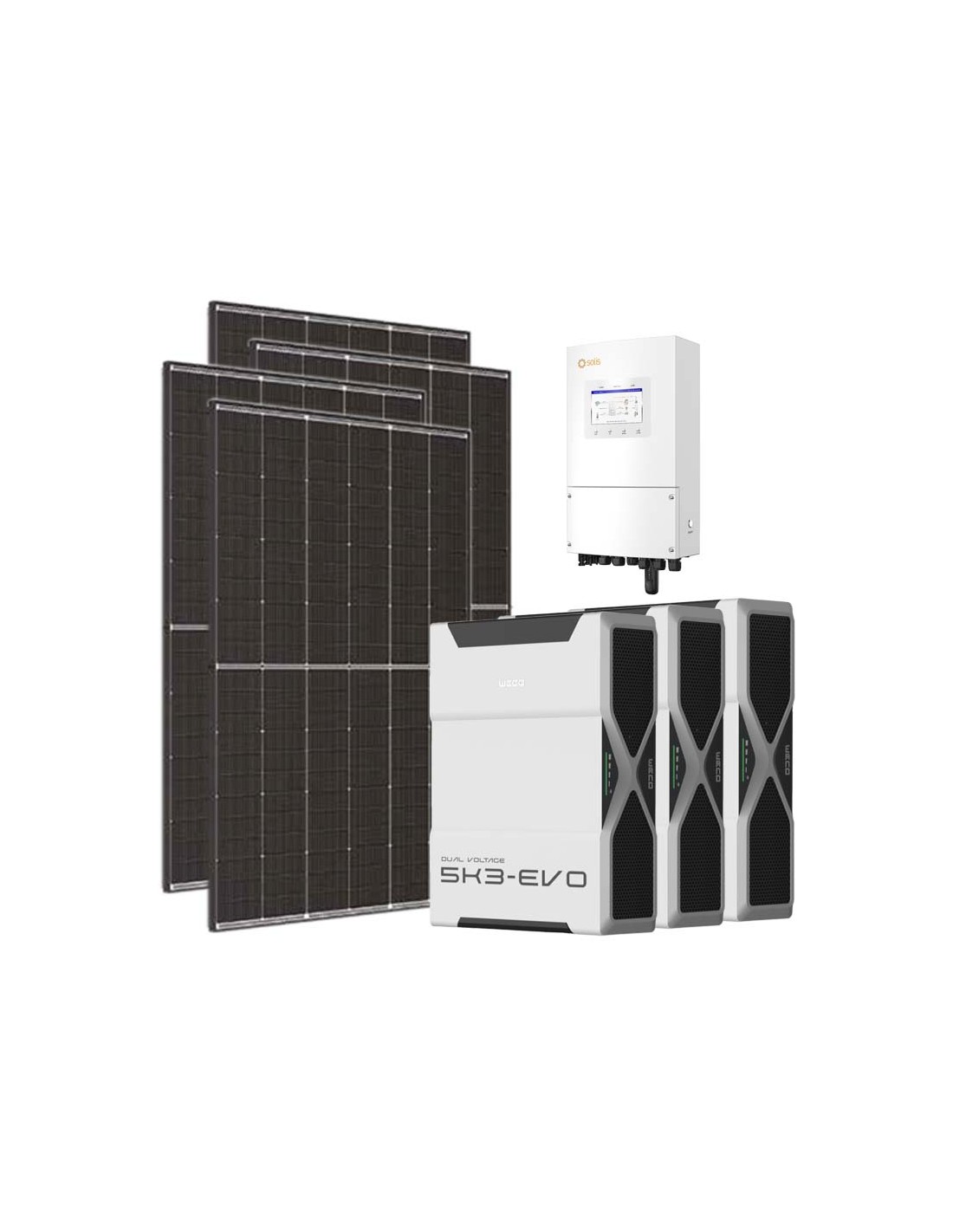 Kit fotovoltaico para conexión a red con almacenamiento en baterías de litio Weco, módulos fotovoltaicos e inversor Solis.