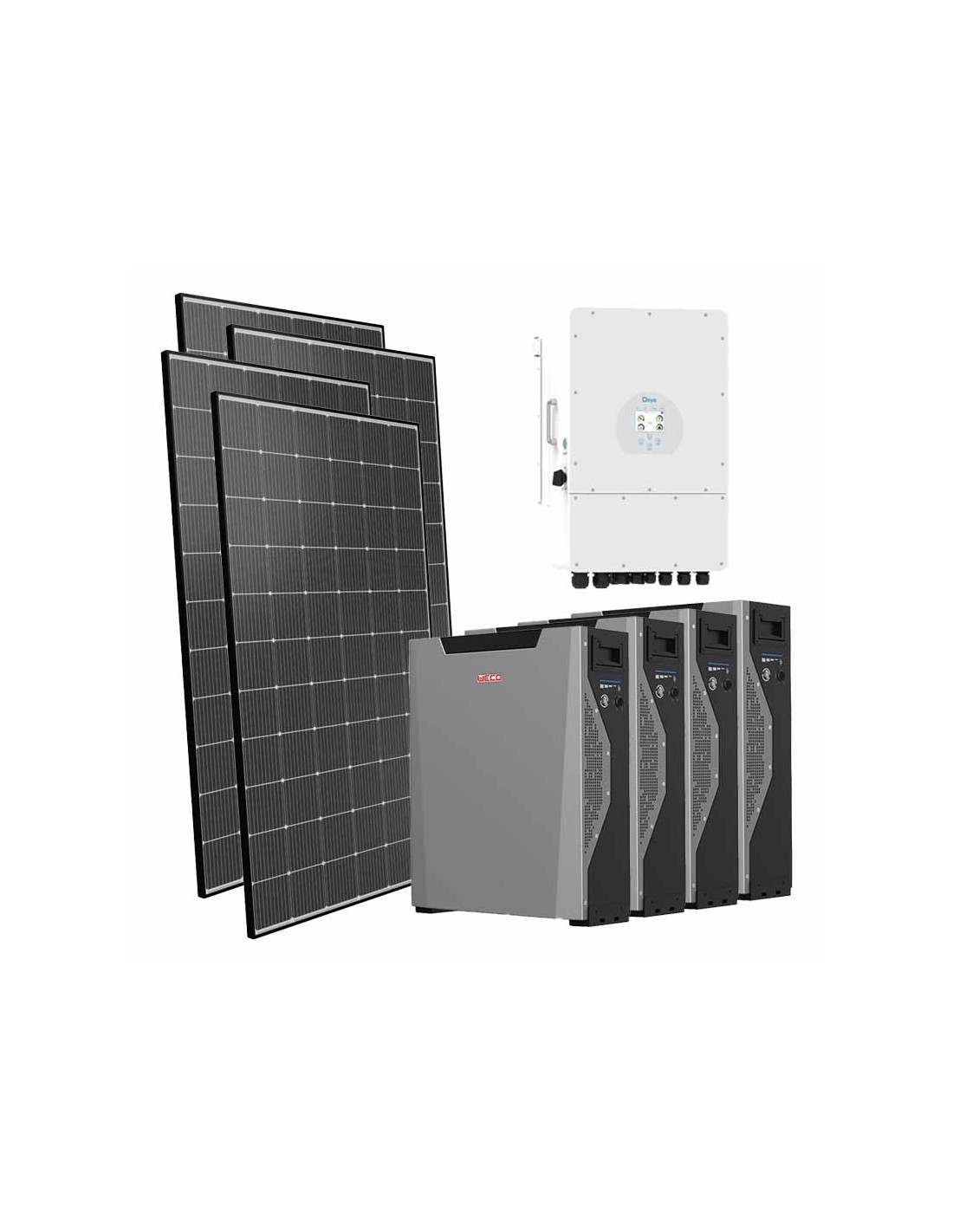 Kit fotovoltaico para conexión a red con acumulador de baterías de litio Weco, módulos fotovoltaicos e inversores Deye.
