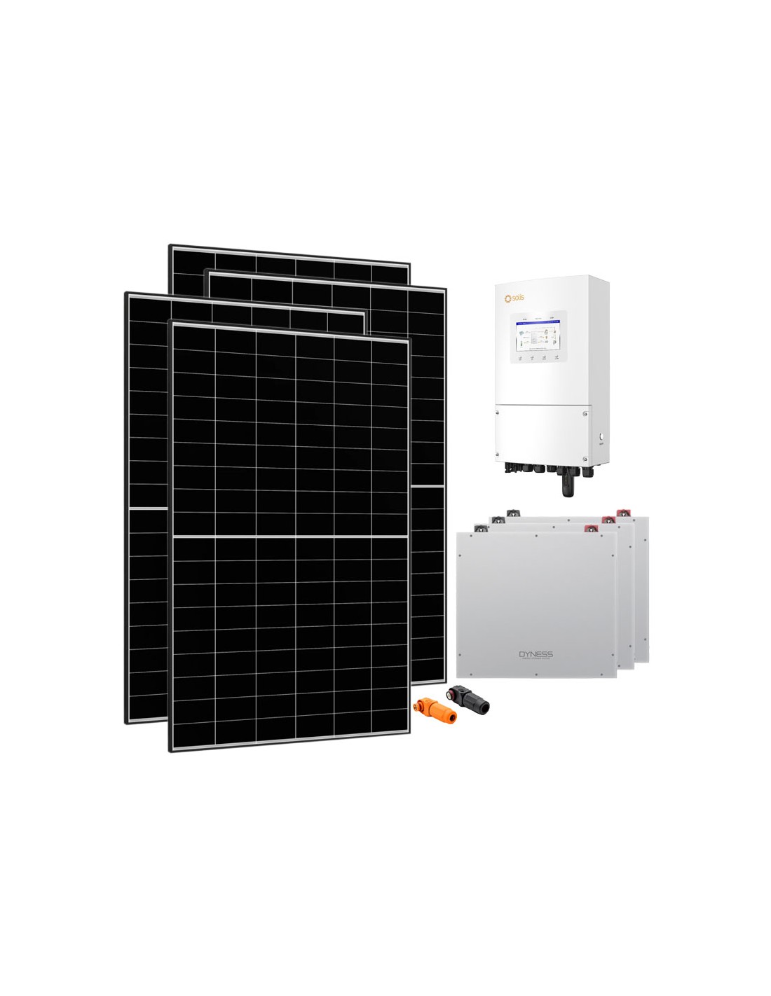 Kit photovoltaïque pour raccordement au réseau avec stockage par batterie lithium Dyness, modules photovoltaïques et onduleur Solis.
