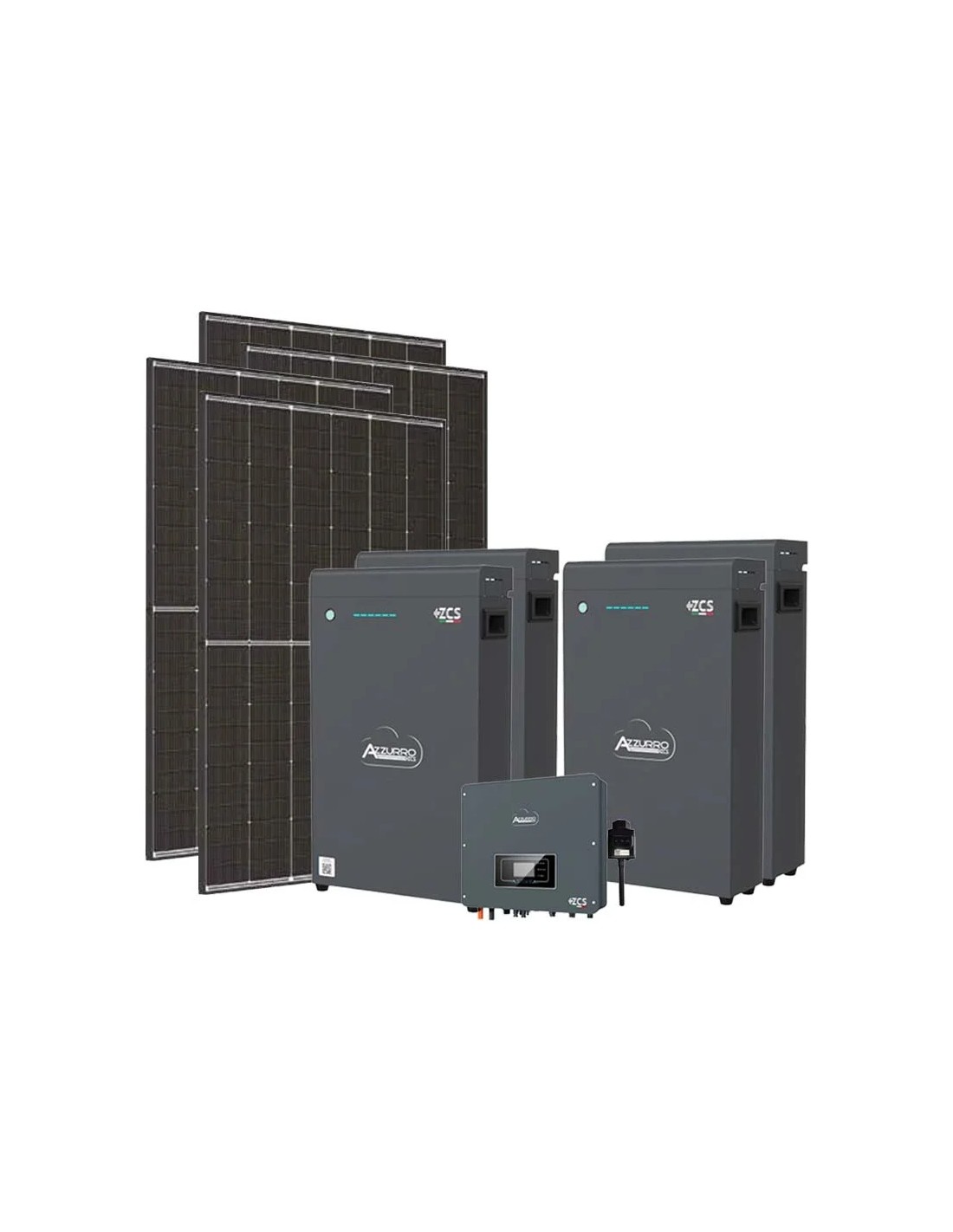 Kit photovoltaïque pour raccordement au réseau avec accumulateurs au lithium ZCS Azzurro, modules photovoltaïques et onduleurs ZCS Azzurro.