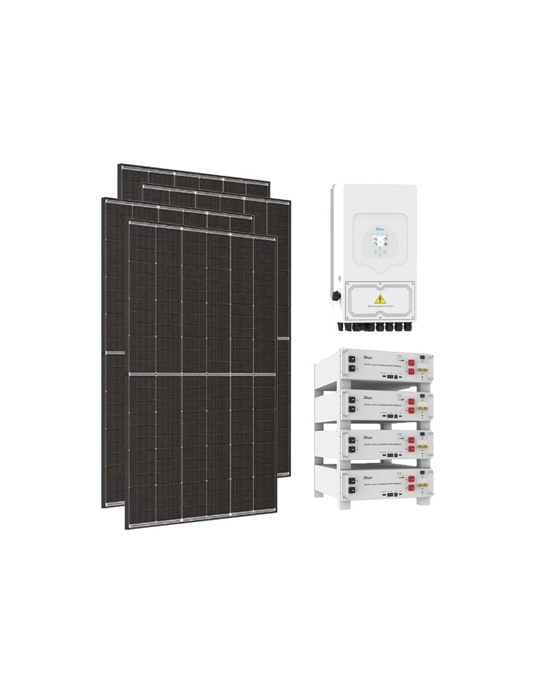 Kit photovoltaïque pour raccordement au réseau avec accumulateurs au lithium Deye, modules photovoltaïques et onduleurs Deye.