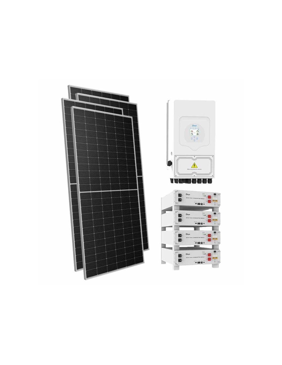 Kit photovoltaïque pour raccordement au réseau avec accumulateurs au lithium Deye, modules photovoltaïques et onduleurs Deye.