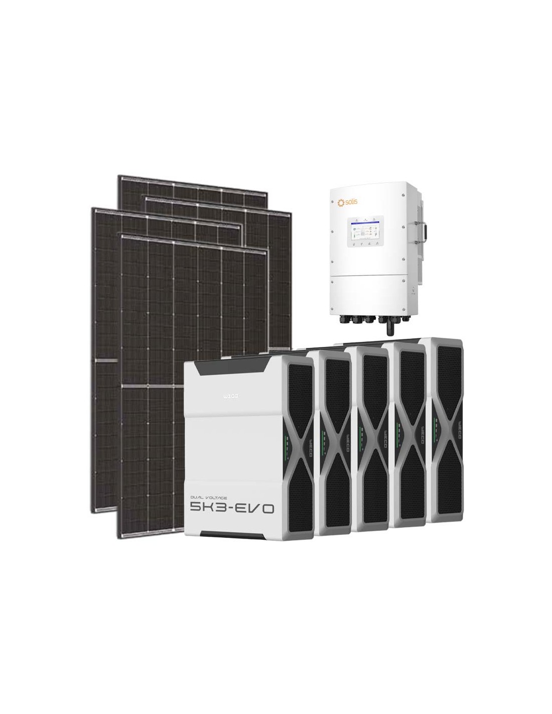 Kit photovoltaïque triphasé 12600W onduleur Solis LV 12kW lithium 31.3kWh Weco EVO 5k3