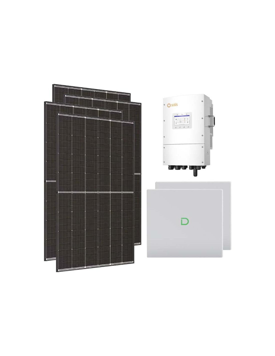 Kit photovoltaïque pour raccordement au réseau avec stockage par batterie lithium Dyness, modules photovoltaïques et onduleur Solis.