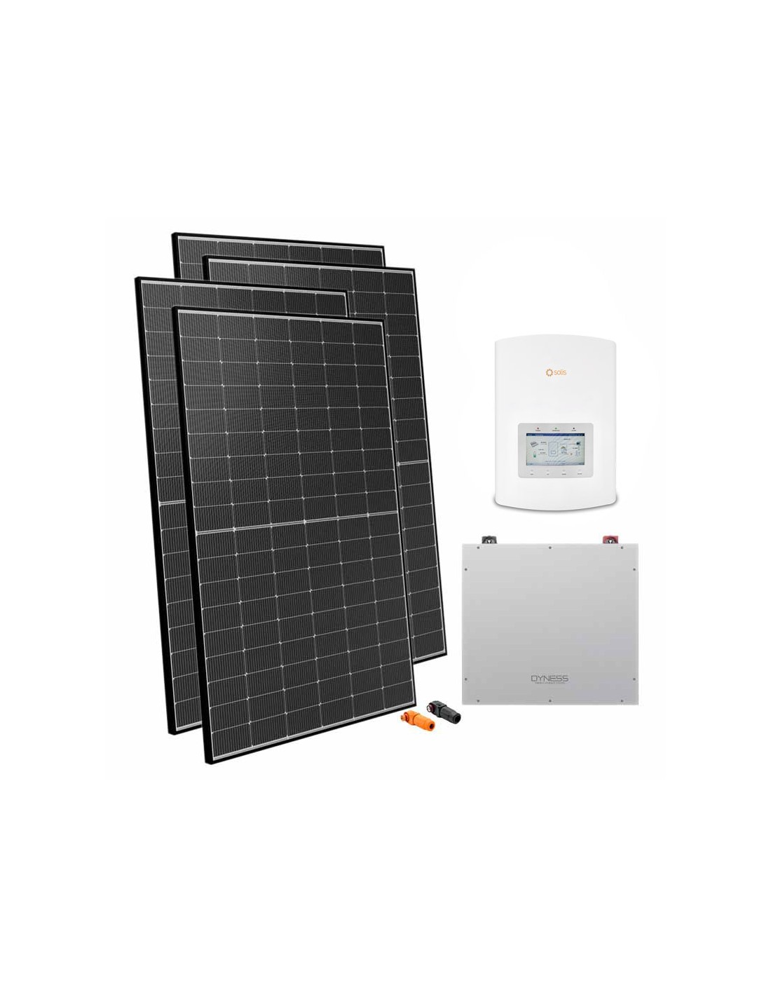 Photovoltaic kit for grid connection with Dyness lithium battery storage, photovoltaic modules and Solis inverter.