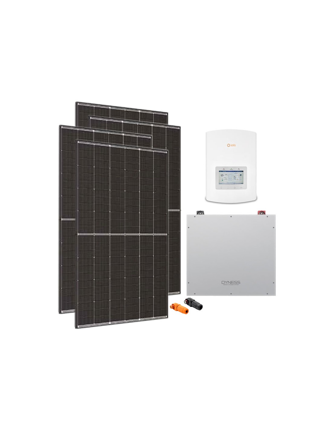 Photovoltaic kit for grid connection with Dyness lithium battery storage, photovoltaic modules and Solis inverter.