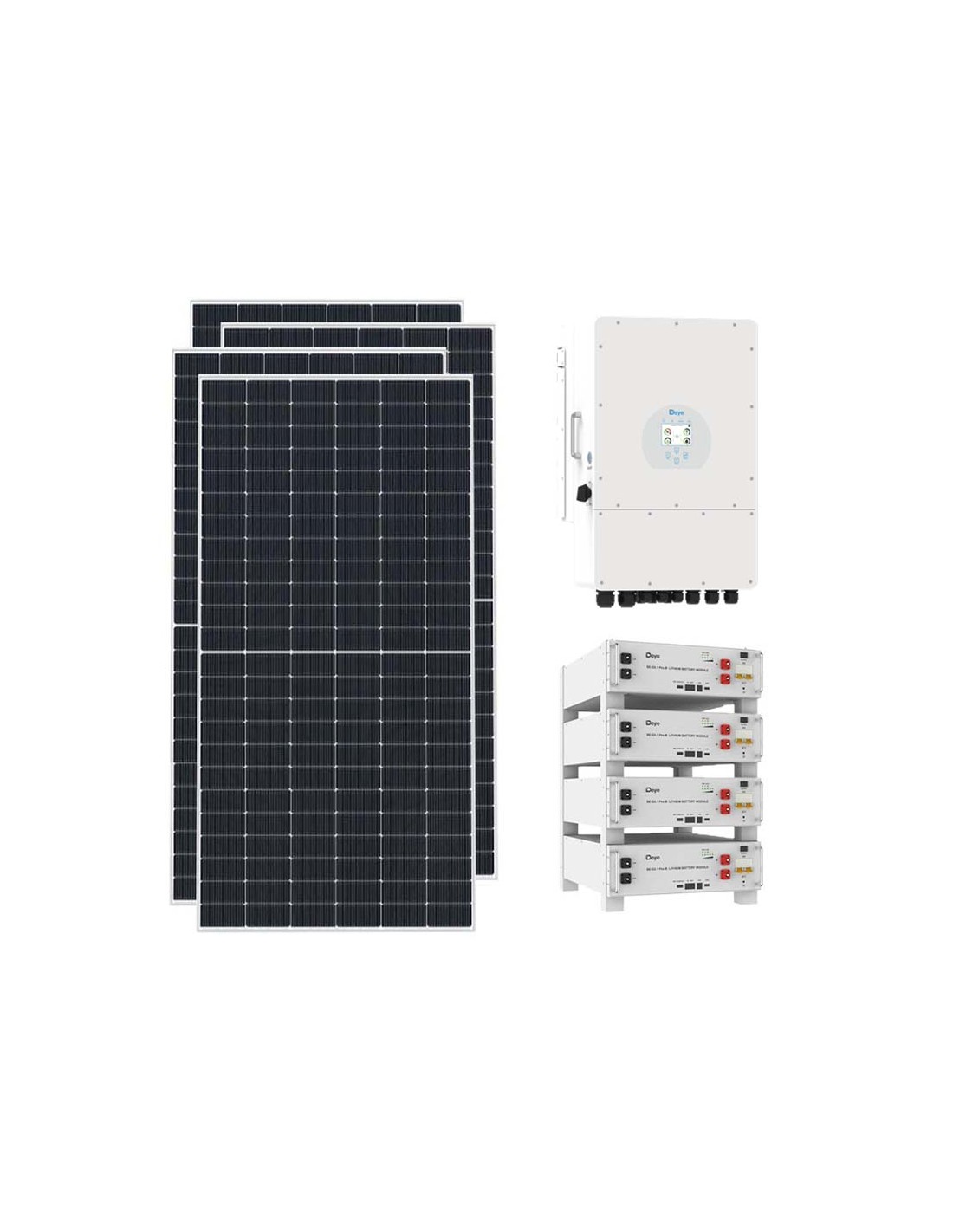 Photovoltaic kit for grid connection with Deye lithium battery storage, photovoltaic modules and Deye inverters.