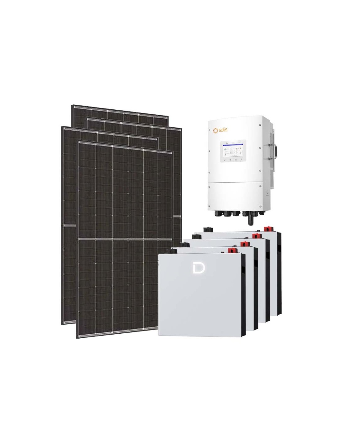 Photovoltaic kit for grid connection with Dyness lithium battery storage, photovoltaic modules and Solis inverter.